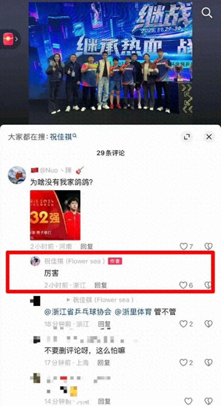 近日,前乒乓球国手祝佳祺在个人短视频平台上发了一则参加2025张继科杯团体赛与张继科合影的视频。
