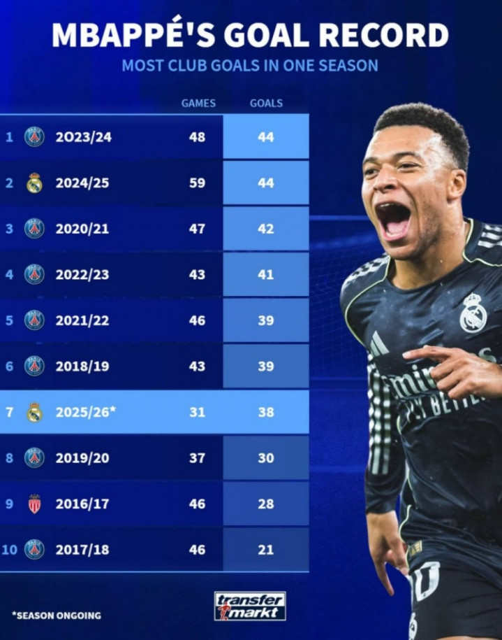 直播吧2月14日讯姆巴佩本赛季各项赛事31场比赛已经打进38球,距离个人单赛季俱乐部进球纪录还差6球,以下为具体情况: